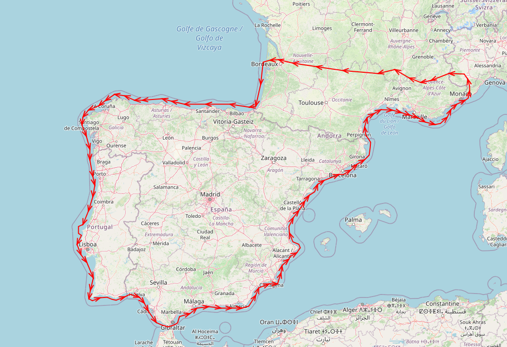 Portugal, Spanien (ohne Inseln) und Monaco (jeweils komplette Region), sowie Südosten von Frankreich.