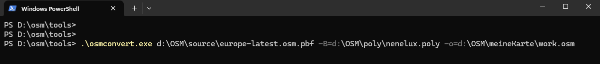 EXE-Datei habe ich in den Ordner „D:\OSM\tools“ kopiert. Den Dateinamen „osmconvert64-
