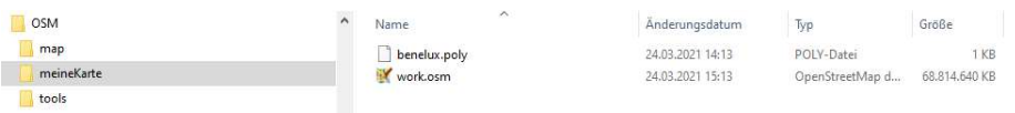 In dem Ordner „meineKarte“ liegt nun die Rohfassung als „work.osm“ mit einer stolzen Größe von über 68 GB.