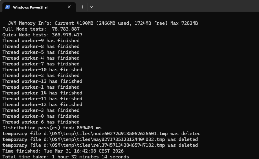 Man sieht das die Prozesse ordnungsgemäß beendet wurden und das kein Fehler angezeigt wird. In meinem Fall wurden im Ordner „OSM\meineKarte\tiles“ 215 Kacheln (tiles) und ein paar andere Dateien erzeugt. Besonders wichtig ist dabei die Datei „template.args“. In dieser steht welche Kacheln zusammengeklebt werden sollen. Man kann (zu Testzwecken) diese Datei auch editieren, damit z.B. nur 4 Kacheln zusammengeklebt werden.