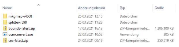 Auf dieser Webseite müssen dann noch zwei weitere Zip Dateien heruntergeladen werden: „boundslatest.zip“ und „sea-latest.zip“. Diese beiden Dateien enthalten die Ländergrenzen und die Küstenlinien. Die beiden Dateien dürfen nicht entpackt werden! Die beiden Zip-Dateien werden ebenfalls in den